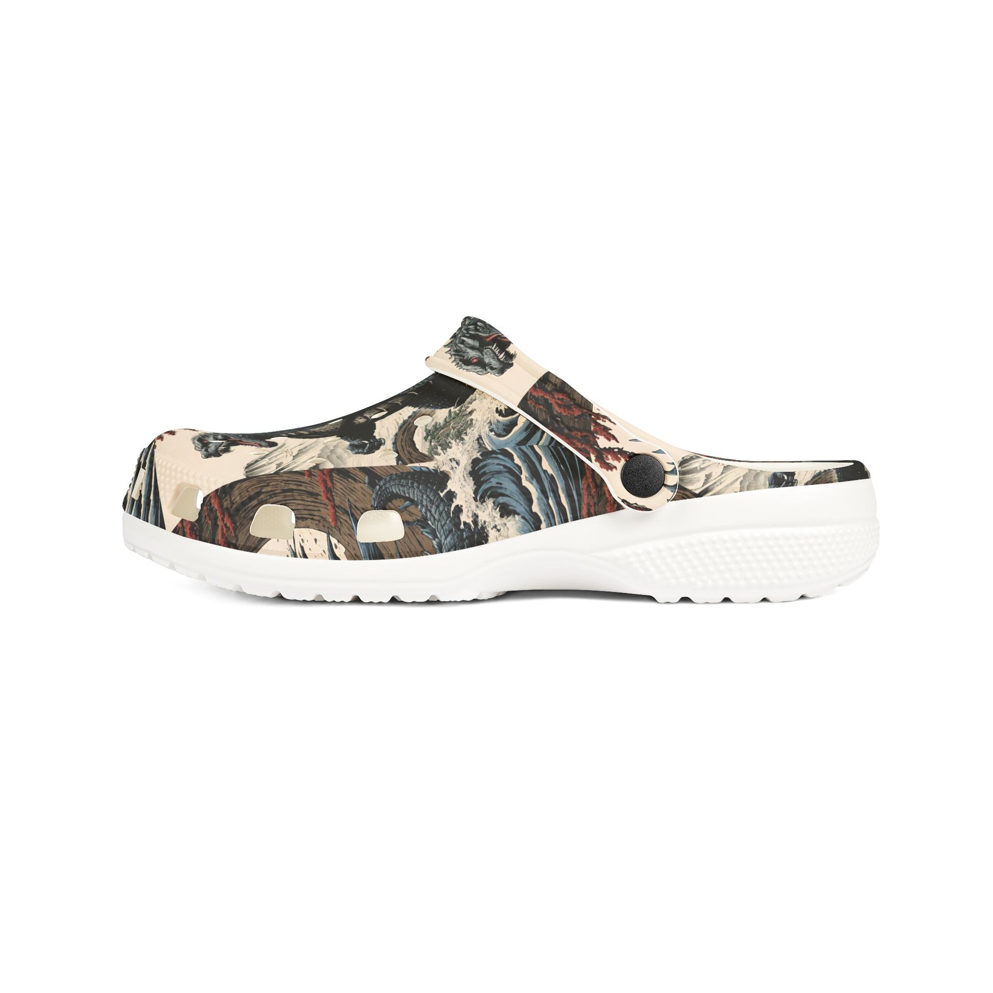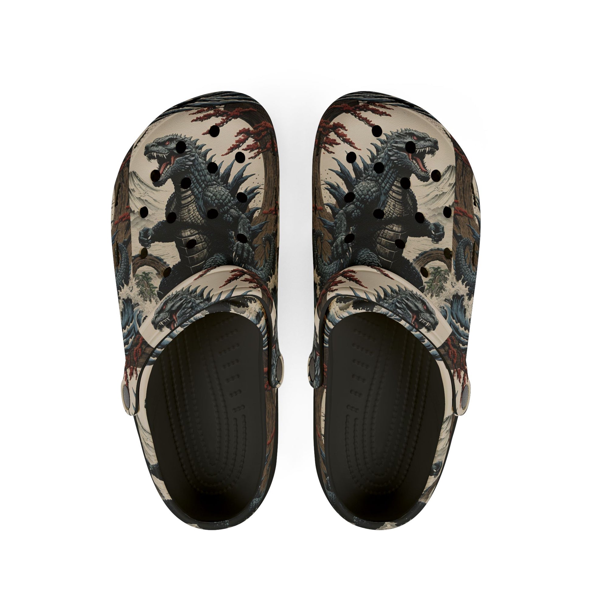 Ancient Japanese Kaiju rubber shoes with Godzilla clogs design in Japanese art style. These trendy all over printed clogs are perfect for indoor and outdoor wearing, offering a great wearing feeling and anti-slip performance. Relevant to fans of Kaiju and Japanese art, perfect for casual wear or themed events. Ideal for Godzilla fans and those looking for unique footwear. Great for cosplay, Halloween, and movie marathons.