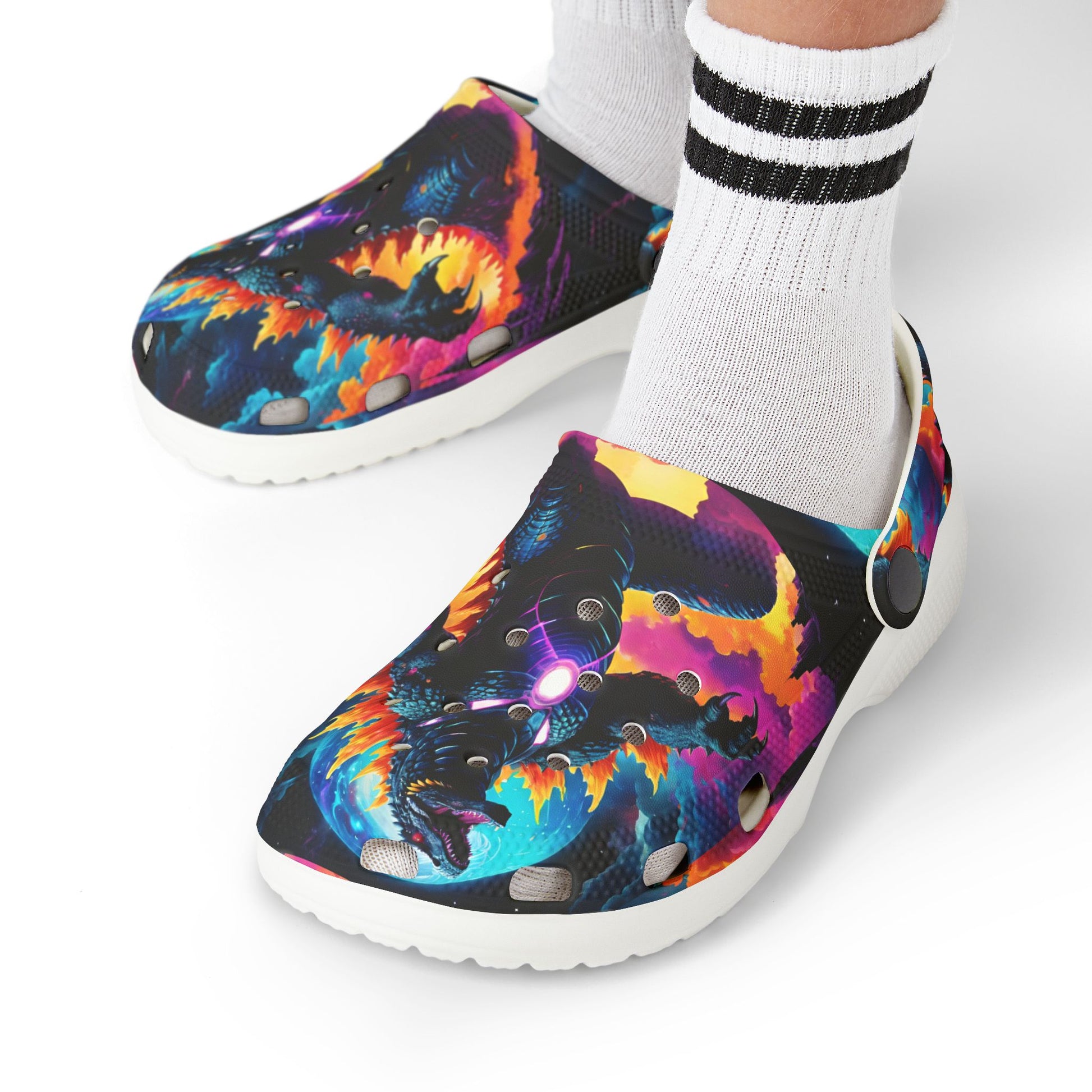 Electric Galaxy Godzilla kids clogs featuring a Kaiju design, perfect for little Godzilla lovers. These rubber clogs are comfortable for all-day wear and come with fun clog accessory charms. Relevant for birthdays, holidays, and everyday wear for kids.