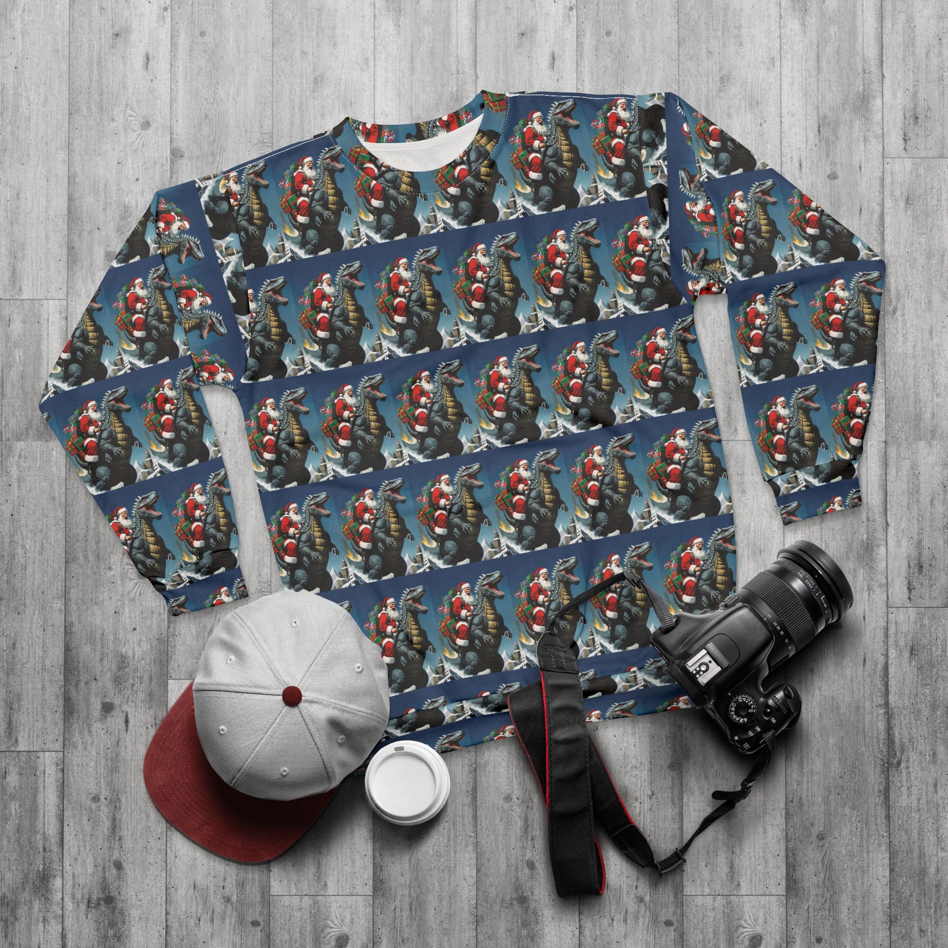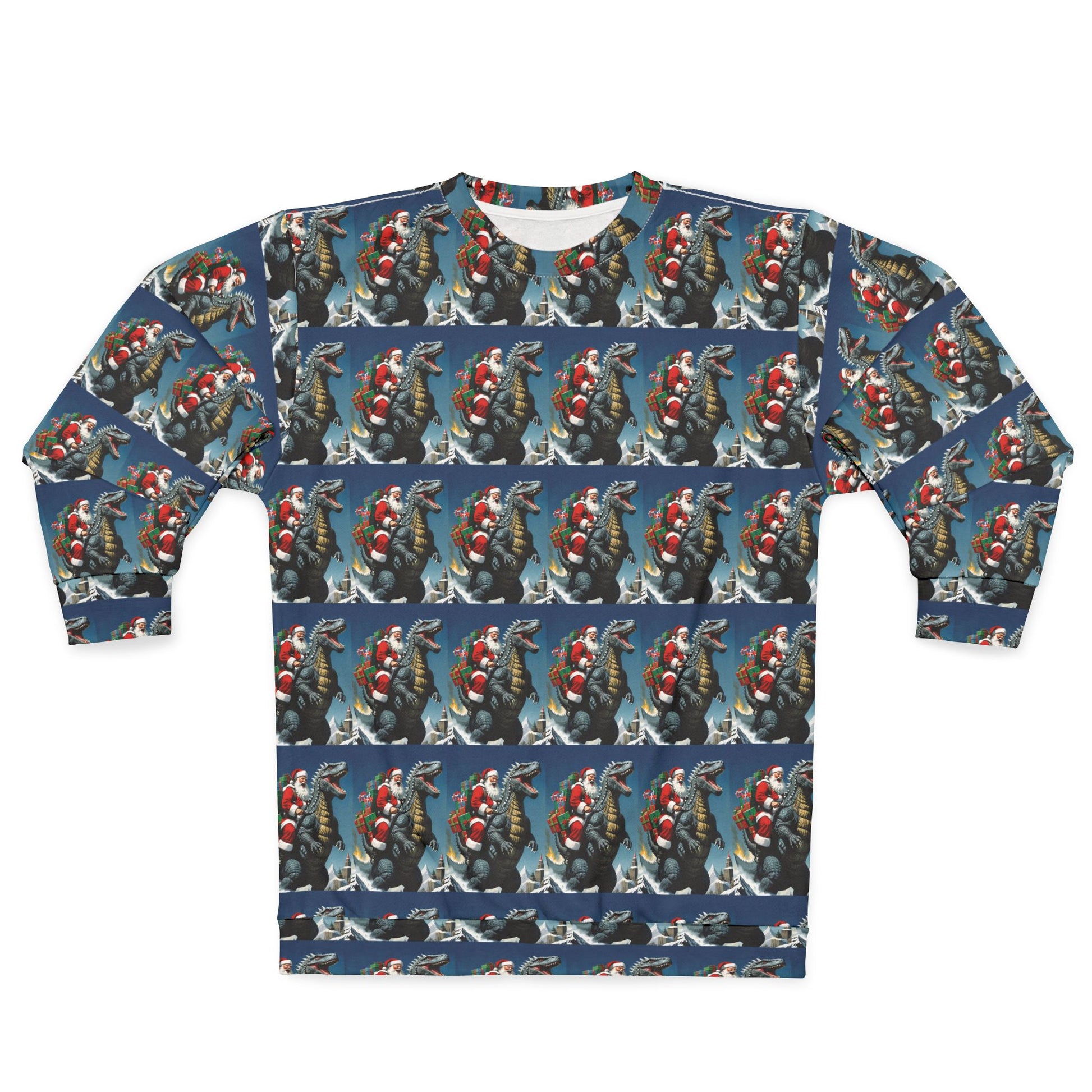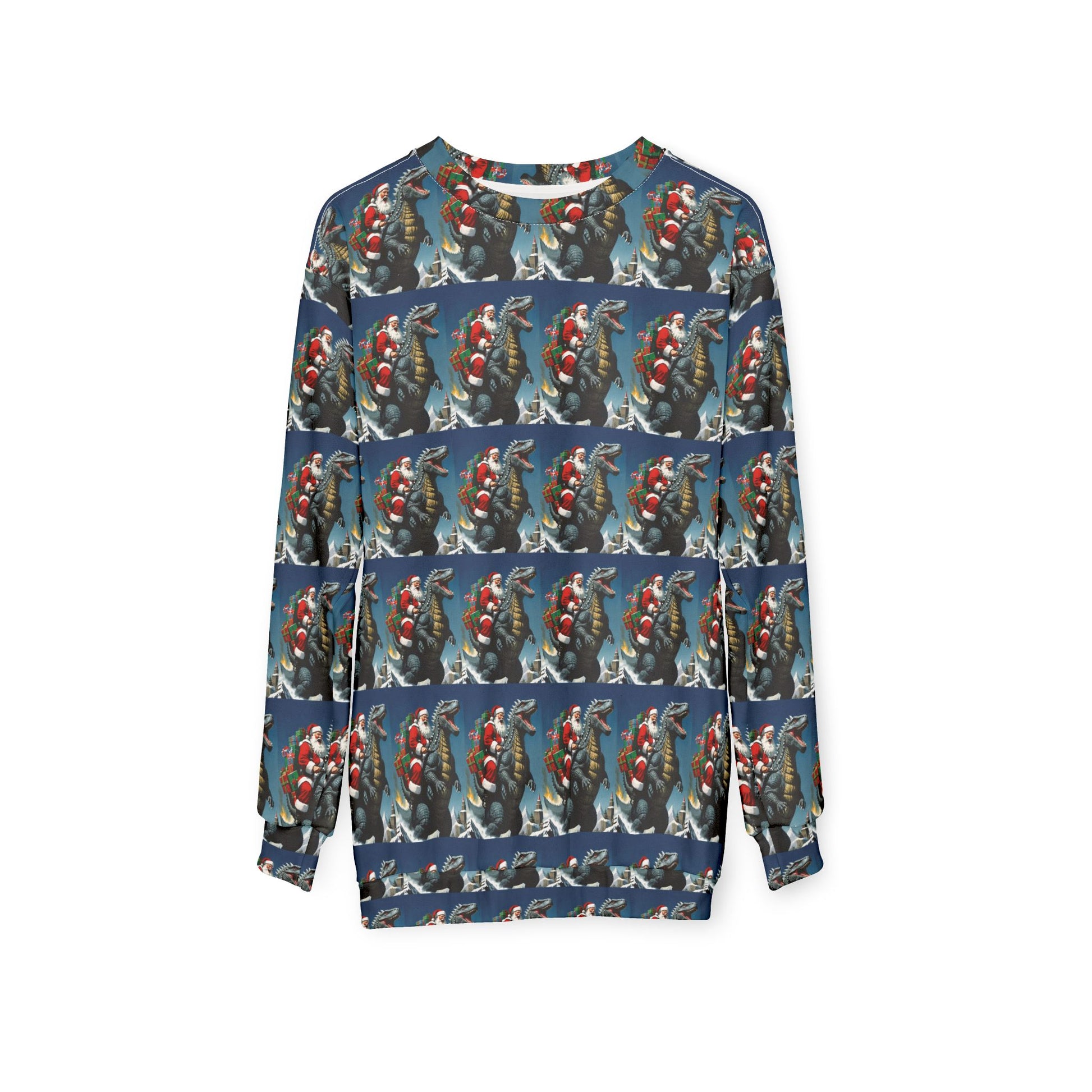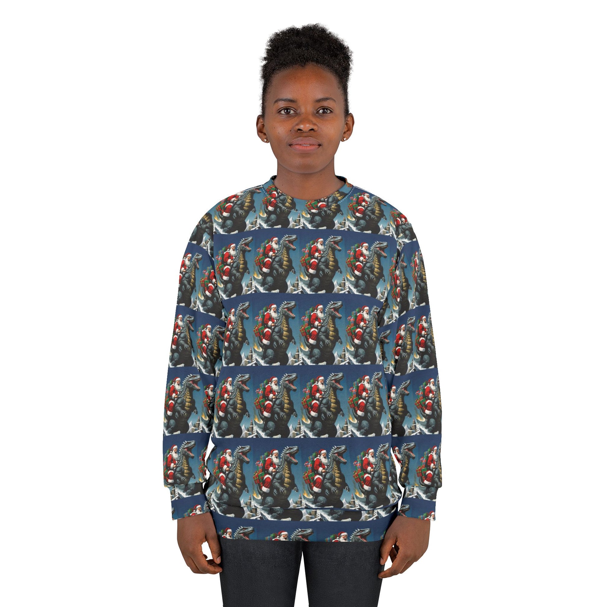 Celebrate Christmas with this Godzilla and Santa themed sweatshirt, perfect for those who love unique and festive designs. The bright and intense colors make this ugly Christmas sweater stand out, adding a fun and quirky vibe to your winter wardrobe. This unisex sweatshirt is ideal for fans of Godzilla and anyone looking to make a statement during the holiday season.